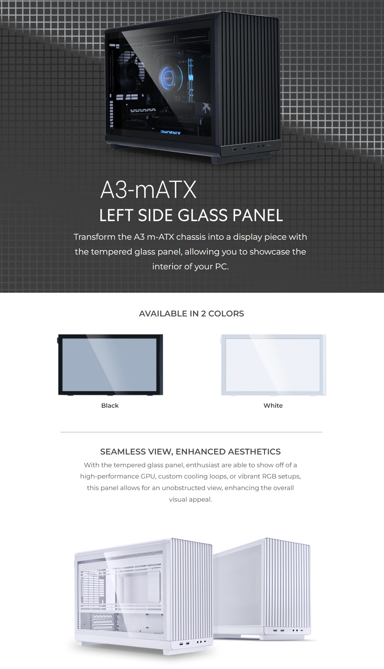 Upgrade your Lian Li A3 m-ATX case with the Lian Li Left Side Tempered Glass Panel, Black. This sleek accessory replaces the mesh panel, offering a seamless and clear view of your internal components. Perfect for showcasing your build. Fast dispatch and delivery of local stock, ensuring quick installation. Buy now and enhance your PC case aesthetics.