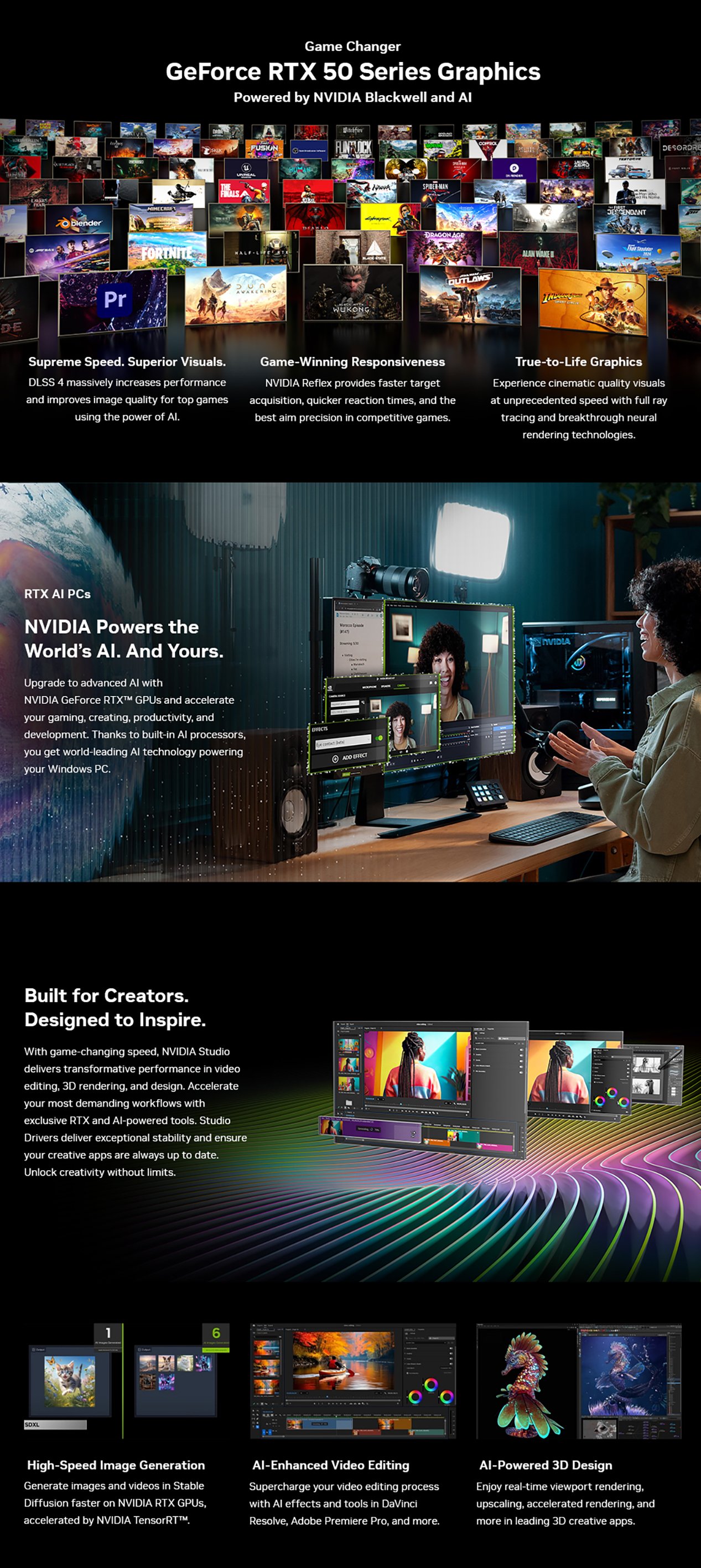 | Display Outputs | 3 x DisplayPort 2.1b with UHBR20 (up to 4K 480Hz or 8K 165Hz with DSC) 1 x HDMI® Connector (Supports 4K 480Hz HDR or 8K 120Hz HDR with DSC, and Gaming VRR as specified in the HDMI 2.1b Specification) |