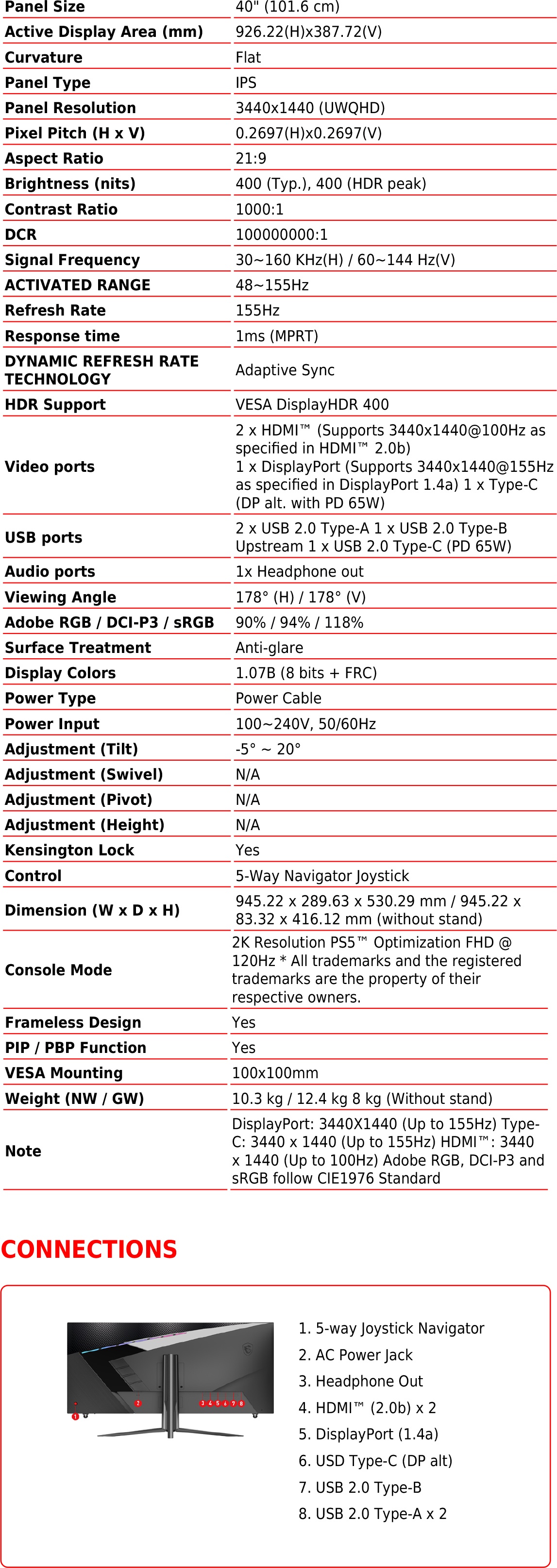 Experience immersive gaming with the MSI MAG401QR 40" Ultra Wide Monitor. Boasting a UWQHD resolution on a 21:9 IPS display, it delivers crisp visuals at a lightning-fast 155Hz refresh rate and 1ms response time. Featuring convenient KVM, USB Hub, and Type-C with 65W Power Delivery, plus dynamic MSI Mystic Light, it enhances both functionality and ambiance. Order now for rapid dispatch and quick delivery from our local stock.