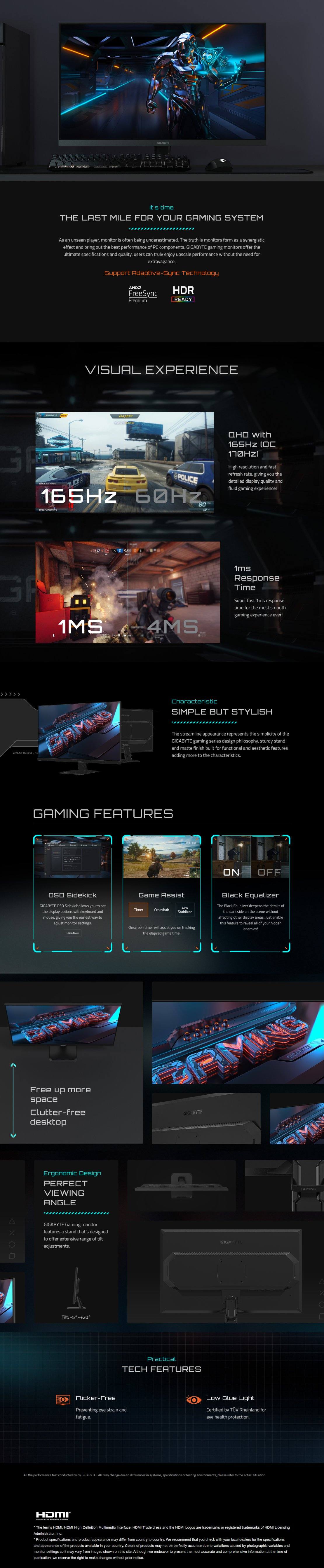 Discover the Gigabyte GS32Q 31.5" QHD Gaming Monitor, featuring a stunning 2560 x 1440 resolution and ultra-responsive 1ms (MPRT) speed. Benefit from a vibrant 100% sRGB color gamut and smooth gameplay with a refresh rate of 165Hz, overclockable to 170Hz, and FreeSync technology. Enjoy flicker-free visuals and fast dispatch with local stock to enhance your gaming experience today!